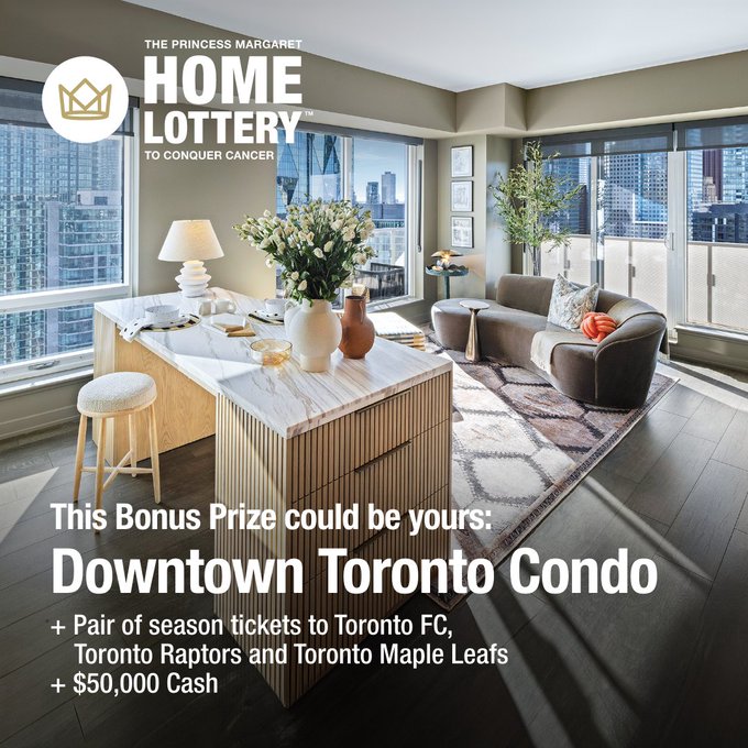@thePMCF The Bonus Prize Deadline is tonight at midnight. A fully furnished and professionally decorated downtown Toronto condo, pair of season tickets to Toronto FC, Toronto Raptors and Toronto Maple Leafs, and $50,000 cash could be yours. Order tickets: bit.ly/4bdlYrr